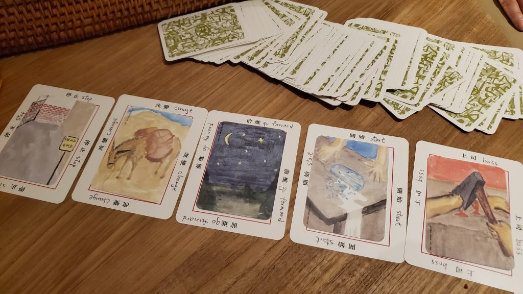 She then laid the first five cards down on the table face-up and placed one of each face-down card on top of each of them. Then, one card at a time, she flipped the top card to reveal an image, to which I was asked to interpret how it related to the word card.