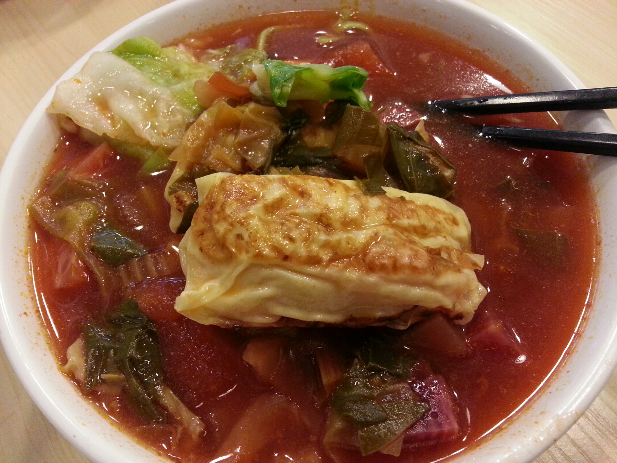 I tried the beetroot soup with spinach noodles and bean curd rolls, which was off the Green menu. It’s not too bad — the soup is sour enough to give it some taste, and there are about 5 bean curd rolls to fill you up.